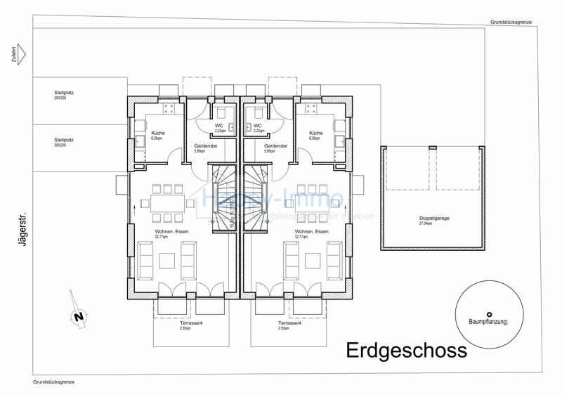 - Grundstück für eine westliche Doppelhaushälfte zu ca. 232 qm und eine östliche Grundstückshälfte zu ca. 263 qm