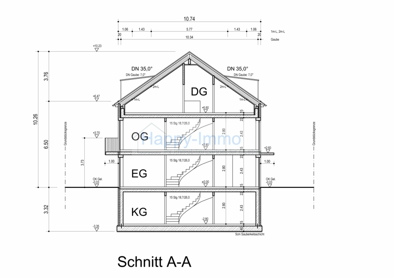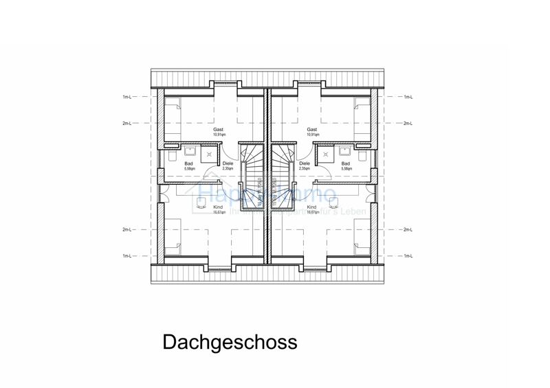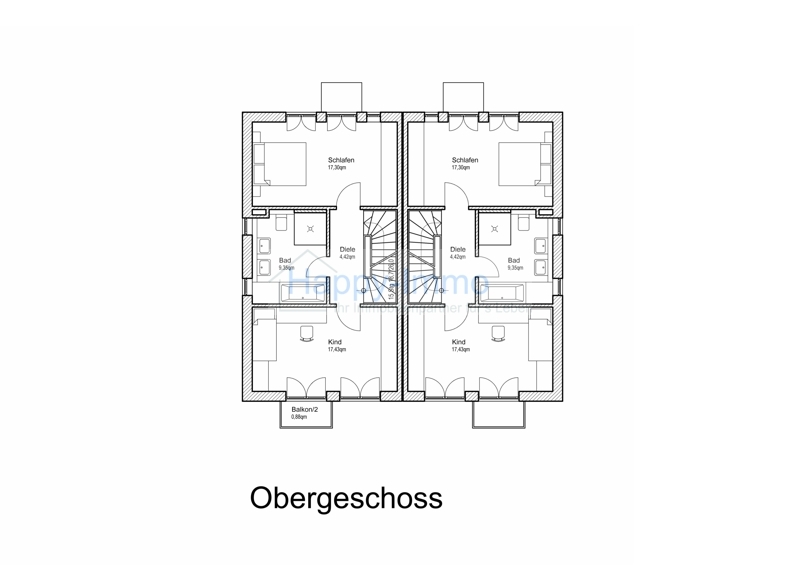 Doppelhaus mit ca. 11,89 auf 10,74 Meter Grundfläche mit 2 Vollgeschossen und Dachgeschoß.