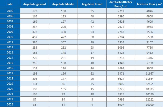 Dies umfasst die Immobilienarten: Gartenwohnung, Terrassenwohnung, Etagenwohnung, Dachgeschosswohnung und Appartement (jew. renovierungsbedürftig bis Neubau).